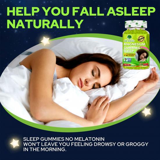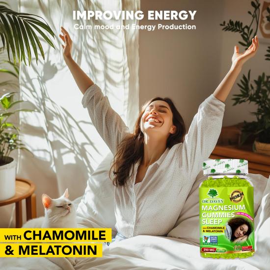 تحتوي هذه الحلوى من دكتور ديفي (٦٠ قطعة في العبوة) على ٢٥٠ ملغ من المغنيسيوم، بالإضافة إلى البابونج والميلاتونين، كمكمل غذائي غير معدل وراثيًا. صُممت هذه الحلوى لدعم النوم (النوم العميق والمستمر)، كما أنها تساعد على استرخاء العضلات، وتقوية العظام، وتحسين وظائف الدماغ والقلب، وتعزيز صحة الجهاز المناعي. تشمل فوائدها الإضافية تخفيف التوتر، وتحسين التركيز، وزيادة إنتاج الطاقة، مما يحقق التوازن بين الراحة والنشاط اليومي.