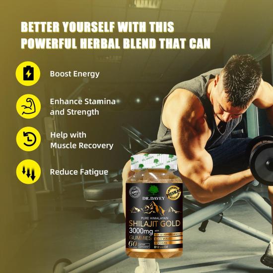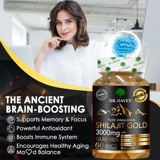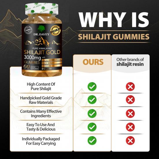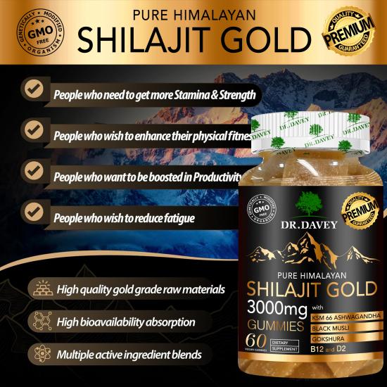 تحتوي هذه الحلوى من دكتور ديفي (٦٠ قطعة في العبوة) على ٣٠٠٠ ملغ من شيلاجيت الهيمالايا النقي (مواد خام من الدرجة الذهبية)، بالإضافة إلى أشواغاندا KSM-66، وموسلي الأسود، وجوكشورا، وفيتامين ب١٢، وفيتامين د٢. صُممت هذه الحلوى كمكمل غذائي، وتهدف إلى تعزيز الطاقة، وتحسين القدرة البدنية والقوة، ودعم استشفاء العضلات، وتقليل التعب، وتحسين الوظائف الإدراكية (الذاكرة والتركيز). كما توفر هذه التركيبة النباتية الخالية من الكائنات المعدلة وراثيًا فوائد مضادة للأكسدة، ودعمًا للمناعة، وتوازنًا للمزاج، مما يجعلها مناسبة لمن يسعون إلى تحسين صحتهم ولياقتهم البدنية.