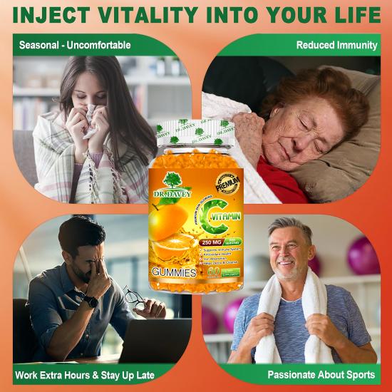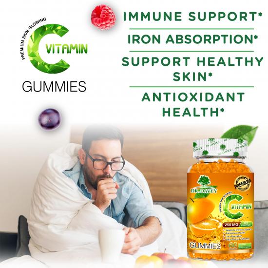 توفر هذه الحلوى المطاطية بفيتامين سي من دكتور ديفي 250 ملغ من فيتامين سي لكل حصة، وهي مصممة كمكمل غذائي. تدعم هذه الحلوى جهاز المناعة، وتعزز صحة الجسم بمضادات الأكسدة، وتساعد على امتصاص الحديد، وتساهم في تنظيف الجسم من السموم. صُممت للاستخدام اليومي، وتستهدف مشاكل مثل الانزعاج الموسمي، وضعف المناعة، والإرهاق (مثل الإرهاق الناتج عن السهر)، كما تدعم إنتاج الكولاجين وصحة البشرة. يوفر شكل الحلوى المطاطية (60 قطعة في العبوة) طريقة سهلة ولذيذة لزيادة تناول فيتامين سي يوميًا.