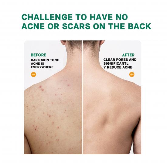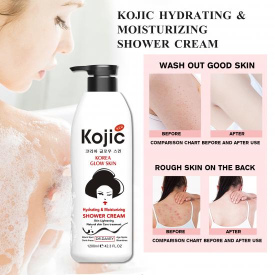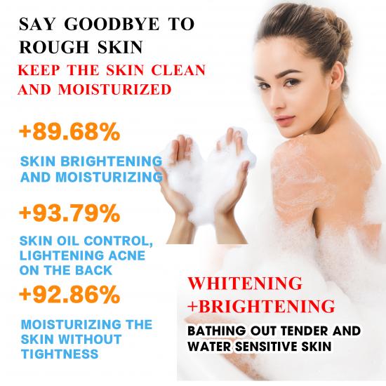 كريم الاستحمام هذا، الغني بحمض الكوجيك، يستهدف حب الشباب في الظهر، ولون البشرة الداكن، وملمسها الخشن: فهو ينظف المسام، ويقلل حب الشباب بشكل ملحوظ، ويفتح لون البشرة بنسبة 89.68%، ويتحكم في إفراز الزيوت (بفعالية 93.79%)، ويحافظ على ترطيب البشرة دون أن يسبب شدًا. يمنحك بشرة نظيفة، ناعمة، ومشرقة بعد كل غسلة.
