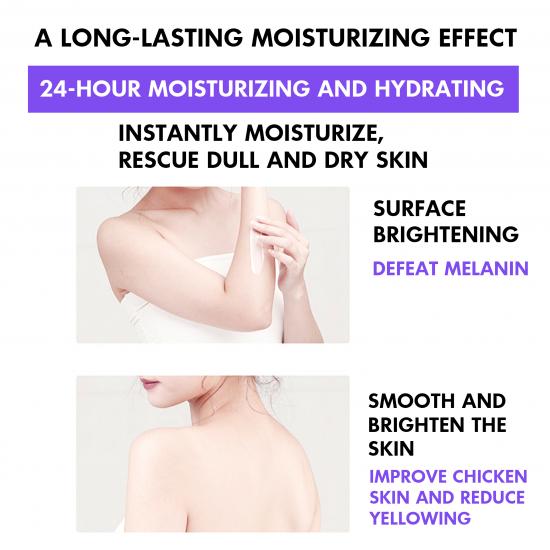تركيبة غنية بحمض الجليكوليك وحمض اللاكتيك (موصى بها من قبل أطباء الجلدية)، توفر هذه اللوشن ترطيبًا يدوم 24 ساعة: فهي تُنعش البشرة الباهتة والجافة فورًا، وتُنعّم المناطق الخشنة والمتكتلة (بما في ذلك جلد الدجاجة)، وتُفتّح لون البشرة عن طريق تثبيط إنتاج الميلانين، وتُقلّل من الاصفرار. تركيبتها غير الدهنية تحافظ على ترطيب البشرة، وتُجدّد ملمسها، وتمنحها إشراقة تدوم طويلًا.