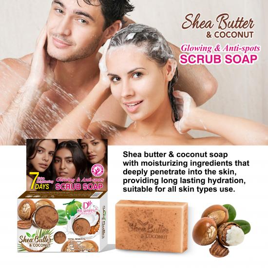 يجمع هذا الصابون المقشر بين زبدة الشيا وجوز الهند، وهو مصمم لتفتيح البشرة خلال 7 أيام مع معالجة البقع وحب الشباب والزيوت الزائدة. تركيبته المرطبة تنظف البشرة بعمق (مناسبة للبشرة الدهنية) دون أن تسبب جفافها أو شدها، كما أنها تحسن ملمسها غير المتجانس. رغوته الناعمة مناسبة لجميع أنواع البشرة، وتهدف إلى استعادة نضارة وإشراقة البشرة.